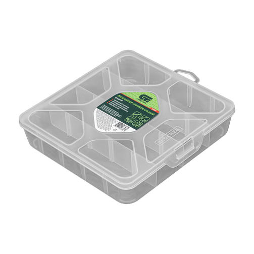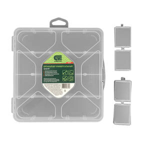 Универсальный средний органайзер Сибртех 90727 размером 200 х 200 х 45 мм, прозрачный матовый, используется для практичного хранения мелких предметов. Он подходит для распределения снастей, крепежа, хозяйственных мелочей и других предметов. Органайзер позволяет компактно расположить вещи в скрытых уголках квартиры: в шкафу, под кроватью и т.д. Преимущества Полипропиленовый корпус — вещи защищены от влаги и пыли. Полупрозрачное исполнение — не нужно открывать крышку, чтобы увидеть содержимое органайзера. Переставные перегородки — размер ячеек можно регулировать для сортировки мелких и больших предметов. 410,00 ₽ / шт