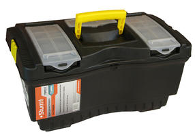Ящик для инструмента со съемными органайзерами для мелкого крепежа являются незаменимым аксессуаром домашнего мастера и профессионала. Изготовлен из ударопрочного пластика и имеет внутреннюю подвижную вставку для мелкого инструмента Прочная ручка позволяет уверенно переносить нагруженный ящик Размер: 22" (56 х 33 х 29 см) 2 400,00 ₽ / шт