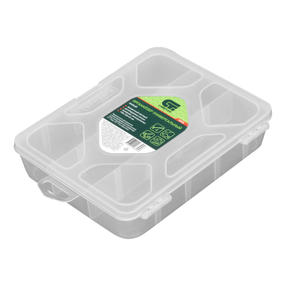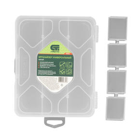 Универсальный малый органайзер Сибртех 90726 размером 190 х 160 х 45 мм, прозрачный матовый, используется для практичного хранения мелких предметов. Он подходит для распределения снастей, крепежа, хозяйственных мелочей и других предметов. Органайзер позволяет компактно расположить вещи в скрытых уголках квартиры: в шкафу, под кроватью и т.д. Преимущества Полипропиленовый корпус — вещи защищены от влаги и пыли. Полупрозрачное исполнение — не нужно открывать крышку, чтобы увидеть содержимое органайзера. Переставные перегородки — размер ячеек можно регулировать для сортировки мелких и больших предметов. 390,00 ₽ / шт