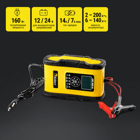 УНИВЕРСАЛЬНОСТЬ - зарядное устройство предназначено для подзаряда и восстановления большинства типов аккумуляторных батарей мототехники, легковых и грузовых автомобилей. АВТОМАТИЧЕСКАЯ ЗАРЯДКА - центральный микропроцессор автоматически определяет напряжение аккумуляторной батареи 12 В или 24 В, тестирует ее и устанавливает необходимый алгоритм для последующего процесса заряда. ПРОСТОТА ИСПОЛЬЗОВАНИЯ - для начала работы необходимо подключить зарядное устройство к аккумуляторной батареи и выбрать соответствующий тип заряда. По окончанию работы зарядное устройство перейдет в ждущий режим и отобразит результат работы. ВИЗУАЛЬНЫЙ КОНТРОЛЬ - дисплей на корпусе отображает текущее состояние аккумуляторной батареи, процесс заряда/восстановления, а также выбранный режим работы и прочие параметры. ЛЕТНИЙ И ЗИМНИЙ РЕЖИМ РАБОТЫ - центральный микропроцессор автоматически корректирует параметры заряда в зависимости от температуры окружающей среды для мягкого восстановления и получения более глубокого заряда аккумуляторной батареи. РЕЖИМ ВОССТАНОВЛЕНИЯ - позволяет мягко восстановить аккумуляторную батарею после глубокого разряда для обеспечения продолжительного срока службы. ПОЛНАЯ ЗАЩИТА - зарядное устройство оснащено защитой от перегрузки, перегрева, короткого замыкания, неправильной полярности подключения кабелей и перезаряда аккумуляторной батареи. УДОБСТВО ТРАНСПОРТИРОВКИ И ХРАНЕНИЯ - небольшие габариты и малый вес обеспечивают удобство при транспортировке и хранении изделия. СЕНСОРНОЕ УПРАВЛЕНИЕ - для выбора режима работы используется сенсорная кнопка на лицевой панели. 5 700,00 ₽ / шт