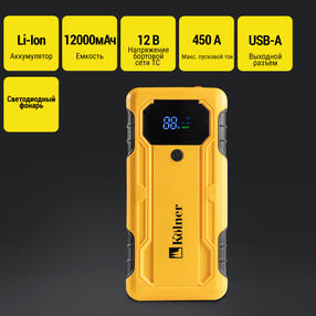 Аккум. пуско-зарядное устройство, 450А, 12В, Kolner KBJS 450/12, Li-lon емкость 12Ач