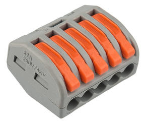 Соединительная многоразовая клемма REXANT на 5 проводников с плоско-пружинным зажимом предназначена для подсоединения медных одножильных и многожильных зачищенных проводников тонкого сечения Перед монтажом с соединяемых проводников необходимо снять изоляцию в соответствии с обозначениями на корпусе клеммы (9-12 мм) Зачищенный участок с монтажной стороны не должен иметь сильных изгибов. Вставьте его в свободное гнездо клеммы, предварительно подняв оранжевый рычажок, после этого опустите рычажок в исходное положение Контакт осуществляется путем зажима проводника пластиной Конструкция предотвращает случайное размыкание контакта Специальное технологическое отверстие на корпусе клеммы предназначено для проверки соединения тестером-пробником или щупом мультиметра Корпус из пластика делает контакт изолированным Извлечение проводника (демонтаж) осуществляется действиями в обратном порядке 60,00 ₽ / шт