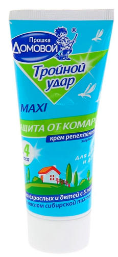 Крем от комаров "Тройной удар" Домовой Прошка , для взрослых и детей старше 5 лет, 50 г. Этот крем предназначен для защиты взрослых от укусов комаров, москитов и мошек. Крем обладает интенсивным уровнем защиты от укусов для взрослых и детей старше 5 лет. Защита от комаров не менее 4-х часов. Крем Домовой от комаров относится к группе наиболее действенных отпугивающих кремов. Способ применения: тонким слоем без втирания нанести крем на открытые участки тела. При необходимости нанести повторно. Избегать попадания в рот, глаза и на поврежденные участки кожи. Хранить отдельно от пищевых продуктов, в местах, недоступных детям. Рекомендуется применять взрослым и детям старше 5-ти лет. В качестве активного начала содержит ДЭТА — 10%. 115,00 ₽ / шт