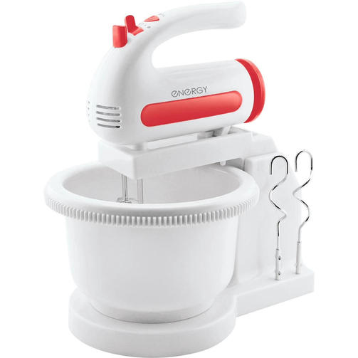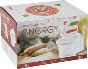 Миксер Energy EN-273 бело-красного цвета с пятью режимами идет в комплекте с пластиковой чашей объемом 1,5 л, парой венчиков и крюков замешивания любого вида теста. Модель работает от сети. Длина шнура составляет 1,7 м. Мощность устройства — 0,2 кВт. Габариты — 21,4х32х30 см. Вес изделия — 1,202 кг. Корпус сделан из прочного пищевого пластика, который легко очищается от загрязнений. Насадки — из металла, устойчивого к образованию коррозии. Способ управления — механический. Насадки легко снимаются с помощью кнопки на корпусе. Присутствует турборежим для активного взбивания. 2 372,00 ₽ / шт