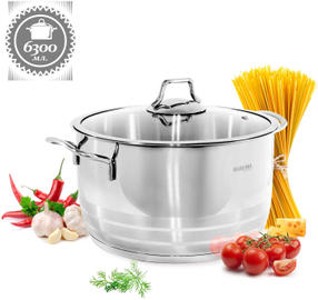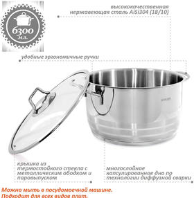 Кастрюля Маруся 63к со стеклянной крышкой 6.3л, нержавеющая сталь . Высококачественная нержавеющая сталь AiSi 304 (соотношение хром/никель 18/10). d-24 см, h-12cм. Пятислойное капсульное дно. Стеклянная крышка. Подходит для всех видов плит, включая индукцию. Подарочная упаковка. Цилиндрическая форма. Серия "Классика". 4 250,00 ₽ / шт