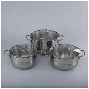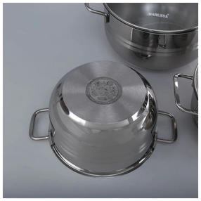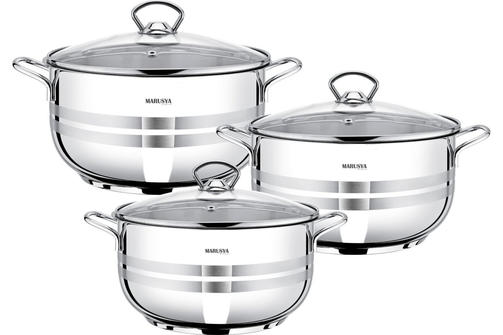Набор кастрюль MARUSYA 6 шт., из нержавеющей стали, со стеклянной крышкой, 3.1 л, 4.5 л, 6 л 3003м предназначен для приготовления пищи. Надежность. Выполнен из высококачественной нержавеющей стали AiSi 304 (18/10 - соотношение хром/никель). Кастрюли удобны в использовании, за ними легко и просто ухаживать. Подходят для всех видов плит. Пятислойное капсульное дно равномерно распределяет тепло и долгое время сохраняет достигнутую температуру, тем самым обеспечивает равномерный нагрев и равномерную подачу тепла во внутрь кастрюли. Пища не пригорает благодаря равномерному распределению тепла по нижней части и стенкам, продукты с высоким содержанием влаги можно подвергать кулинарной обработке без воды и самое главное исключено образование канцерогенных веществ, так как для жарки можно не использовать растительное масло. 10 000,00 ₽ / шт