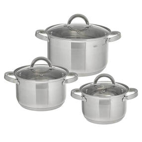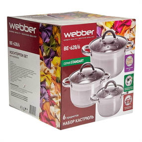 Набор посуды 6 предметов: 3 кастрюли (2,2 л, 3 л, 5,2 л) из нержавеющей стали со стеклянными крышками WEBBER BE-628/6 Параметры В наборе 6 предметов: кастрюля с крышкой 16×10,5 см; 2,2 л кастрюля с крышкой 18×11,5 см; 3 л кастрюля с крышкой 22×13,5 см; 5,2 л Толщина стали 0,5 мм Описание Набор кастрюль из высококачественной нержавеющей стали со стеклянными крышками Серия: Standart Термосберегающее дно: пятислойное дно с повышенной термоотдачей Специальная форма, исключающая скопление остатков пищи и жира Обод, препятствующий переливанию жидкостей через край Быстрый нагрев пищи, длительное удержание тепла Минимальные потери минеральных веществ, витаминов и вкусовых качеств Подходит для использования на всех типах кухонных плит, включая индукционные Подходит для мытья в посудомоечной машине Упаковка: цветная коробка 3 800,00 ₽ / шт