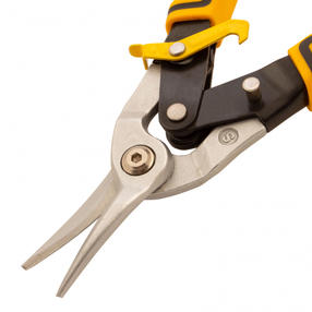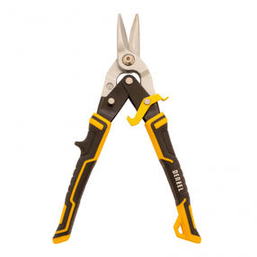 Ножницы по металлу Denzel 78370 общей длиной 270 мм, из стали-CrMo, с трехкомпонентными рукоятками, предназначены для прямого реза листовых металлических заготовок и металлопрофиля толщиной до 1,2 мм. Инструмент с усиленной конструкцией осевого шарнира рассчитан на профессиональное использование. Ножницы используются для проведения строительных, кровельных и слесарных работ. Преимущества Высокое качество исполнения — ножницы изготовлены из прочной хромомолибденовой стали методом горячей штамповки, остро заточенные кованые лезвия с насечками не соскальзывают с заготовок. Эффективность — режущие кромки закалены до твердости 60-62 HRC и легко справляются даже с прочной «нержавейкой». Безопасность — блокировочный замок предотвращает случайное раскрытие лезвий во время транспортировки и хранения. Комфортная работа — плоский соединительный винт не цепляется за заготовки, удлиненные трехкомпонентные рукоятки не выскальзывают из руки. Удобное хранение — на рукоятке имеется проушина для подвешивания на крючок или гвоздь. 2 226,00 ₽ / шт