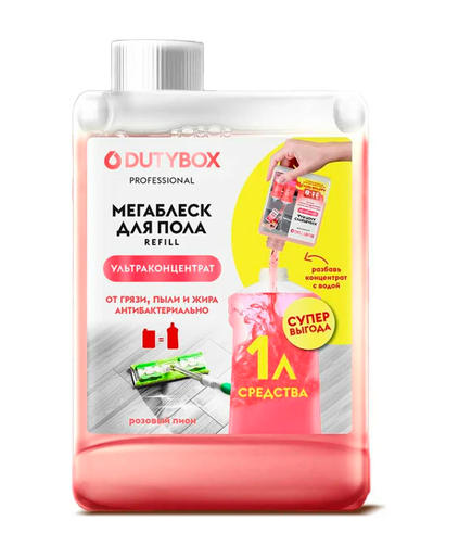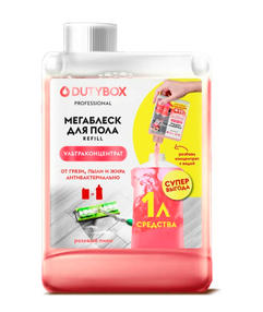 НОВИНКА от DUTYBOX универсальное средство для мытья пола - концентрат 200 мл Dutybox. Эффективно удаляет загрязнения с водостойких поверхностей: для линолеума керамической плитки ламината паркета, дерева, нержавеющей стали. Моющее средство для полов бережно ухаживает за поверхностью, не оставляет следов и разводов на стеклянных покрытиях. Идеально подойдет для уборки стен, потолка, ковровых покрытий. Способ применения: открыть крышку любой емкости (рекомендуемый объем 1000 мл), разбавить 200мл концентрата (весь флакон) с 800 мл воды, взболтать. 125,00 ₽ / шт