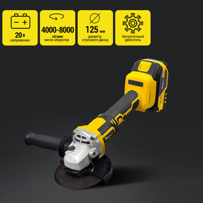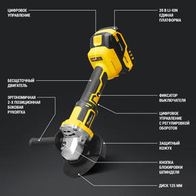 БЕСЩЕТОЧНЫЙ ДВИГАТЕЛЬ: Обладает высоким КПД и крутящим моментом, низким энергопотреблением, а также повышенной надежностью и сроком службы. ДИСК 125 ММ: Изделие предназначено для работы с отрезными и шлифовальными дисками по металлу. ЦИФРОВОЕ УПРАВЛЕНИЕ: Электронный модуль контролирует процессы заряда и разряда аккумулятора, защищает инструмент от перегрузки и позволяет переключать диапазоны числа оборотов электромотора. УДОБСТВО В РАБОТЕ: Эргономичная 2-х позиционная боковая рукоятка делает работу с инструментом более удобной. ФИКСАТОР ВЫКЛЮЧАТЕЛЯ: Повышает удобство использования и снижает утомляемость при продолжительной работе. КНОПКА БЛОКИРОВКИ ШПИНДЕЛЯ: Дает возможность легко и быстро сменить диск. БЕЗОПАСНОСТЬ: Металлический защитный кожух с быстрозажимным креплением предохраняет пользователя от пыли и искр. 20 В LI-ION ЕДИНАЯ ПЛАТФОРМА: Позволяет использовать один аккумулятор с разным электроинструментом и обеспечивает стабильную производительность на протяжении долгого времени. 10 500,00 ₽ / шт
