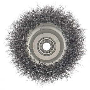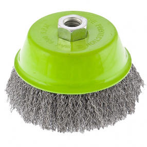 Щетка для УШМ Сибртех «чашка» 746067, М14, диаметром 125 мм, с щетиной из витой проволоки 0,3 мм, предназначена для постепенного снятия тонкого слоя материала с металлических, деревянных и пластиковых поверхностей. Удаляет ржавчину, загрязнения, а также остатки краски и других покрытий. Подходит для обработки участков значительной площади. Щетку устанавливают на вал углошлифовальной машины (УШМ), рекомендуемая максимальная скорость вращения 6500 об/мин. Работать с оснасткой следует в спецодежде. Преимущества: Деформационная стойкость щетины — витая проволока принимает исходную форму после снятия нагрузок. Защита от коррозии — корпус покрыт эмалью, а на щетину нанесено техническое масло. Быстрая установка и замена насадки — щетка крепится на вал УШМ при помощи гайки М14. 1 190,00 ₽ / шт
