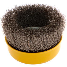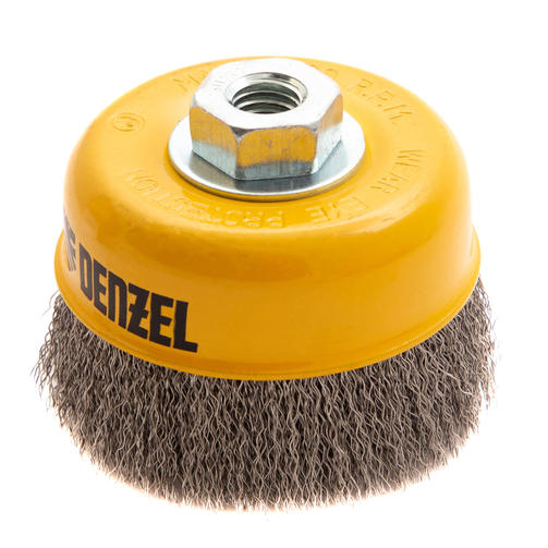 Щетка для УШМ «Чашка» Denzel 746053, М14, диаметром 100 мм, с щетиной из витой нержавеющей проволоки диаметром 0,3 мм, позволяет быстро и аккуратно очистить металлическую, деревянную или пластиковую поверхность от незначительных загрязнений и ржавчины, а также удалить остатки лакокрасочных материалов, сделать поверхность шероховатой или матовой. Насадка подходит для очистки плоских участков большой площади. Поскольку щетина выполнена из нержавеющей стали, щетку можно использовать для обработки изделий из нержавейки. Щетка устанавливается на вал углошлифовальной машины (УШМ) и предназначена для работы с максимальной скоростью 8500 об/мин. Во время работы обязательно соблюдение техники безопасности и использование средств индивидуальной защиты. Щетку применяют в строительстве, на производстве, а также в быту. 829,00 ₽ / шт