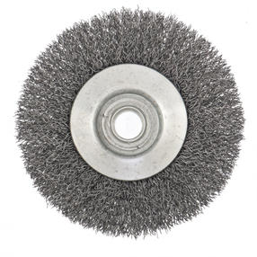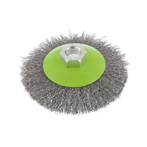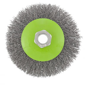 Щетка для УШМ «Тарелка» Сибртех 746087, М14, 100 мм, с щетиной из витой проволоки толщиной 0,3 мм, применяется для очистки металлических, деревянных и пластиковых поверхностей от ржавчины, старых лакокрасочных покрытий и загрязнений. Очищает как плоскости, так и труднодоступные места, поэтому оптимальна для обработки изделий сложной формы. Подходит для придания материалу шероховатости и матовости. Щетка устанавливается на вал углошлифовальной машины и выдерживает вращение со скоростью до 12500 об/мин, что обеспечивает высокую производительность оснастки. Во время работы следует использовать средства индивидуальной защиты. Щетка пригодится для проведения ремонта и решения бытовых задач. Преимущества: Деформационная стойкость щетины — витая проволока принимает исходную форму после снятия нагрузок. Защита от коррозии — корпус покрыт эмалью, а на щетину нанесено техническое масло. Быстрая установка и замена насадки — щетка крепится на вал УШМ при помощи гайки М14. 490,00 ₽ / шт