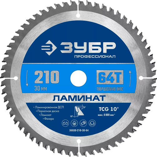 ЗУБР Ламинат, 210 х 30 мм, 64Т, пильный диск по ламинату, Профессионал (36930-210-30-64)