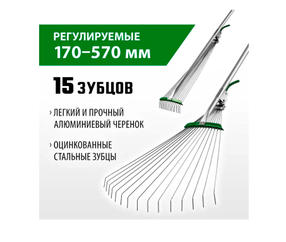 POCTOK РВ-15, 170-570 мм, длина 1180 мм,стальная рабочая часть,алюмин. черенок,веерные грабли 39640