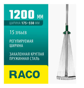 RACO R743, длина 1200 мм, ширина 175-550мм,с черенком,15 зубцов,регул.веерные грабли (4231-53/743)