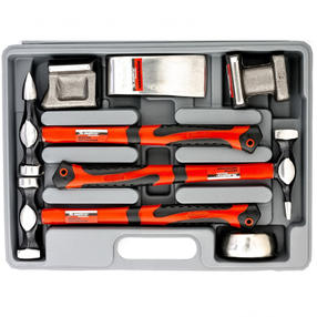 Рихтовочный набор Matrix 10845, включающий 3 молотка с фибергласовыми ручками и 4 наковальни, предназначен для исправления геометрии элементов автомобильного кузова. Наковальни и ударные головки имеют различную форму, что дает возможность работать с деталями разной степени кривизны. Набор используется в автомастерских. Преимущества Рабочие части молотков и наковальни изготовлены из инструментальной стали и закалены до твердости 45-55 и 35-50 HRC соответственно, поэтому инструменты характеризуются прочностью и устойчивостью к ударным нагрузкам. Фибергласовый стержень придает жесткость рукояткам и поглощает отдачу, повышая комфортность и безопасность работы. Набор упакован в прочный пластиковый кейс с ручкой, в котором его удобно хранить и перевозить. 4 450,00 ₽ / шт