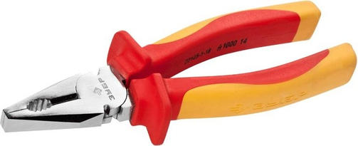 Диэлектрические комбинированные плоскогубцы до1000В, 180мм Зубр ЭКСПЕРТ ЭЛЕКТРОМОНТАЖНИК 22145-1-18 - высоковольтный ручной инструмент с двойной изоляцией, прошедший индивидуальное тестирование под высоким напряжением 1000 В, который идеально подходит для профессиональных электромонтажных работ. Изделие полностью выполнено из высококачественной инструментальной стали С55, губки дополнительно закалены токами высокой частоты и покрыты защитным хромоникелевым составом для предупреждения появления коррозии и механических повреждений. На рукоятках расположены эргономичные двухкомпонентные чехлы с выступами для препятсвия соскальзывания ладони и контакта рабочего с электроустановкой. 1 625,80 ₽ / шт