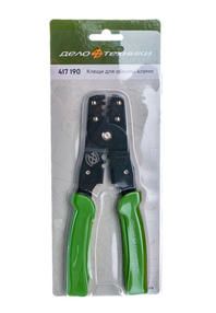 Клещи для обжима клемм Дело Техники 417190 используется для обжима клемм, штекеров и коннекторов. Изделие обладает кусачками для перекусывания проводов и кабелей небольшого диаметра. Рабочая часть выполнена из высококачественной стали. Рукоятки изготовлены из пластика и обеспечивают надежное удержание клещей. Особенности клещей Дело Техники 417190 Прочность конструкции Рабочая часть клещей для обжима клемм Дело Техники 417190 изготовлена из высококачественной стали, выдерживающей большие нагрузки. 510,00 ₽ / шт