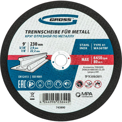 Круг отрезной по металлу 230х2,0х22,2мм, WA36TBF метал.банке, 5шт// Gross 743890