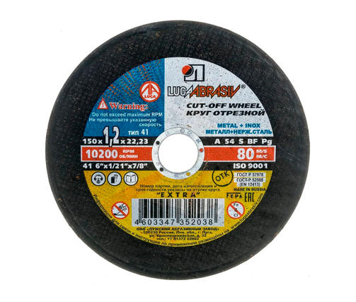 Диск отрезной 150х22х1,2 мм, А54 Луга D11001502212000 предназначен для резки деталей и изделий из металла и нержавеющей стали. Размеры: Внешний диаметр-150 мм, толщина-1,2 мм, посадочное место-22 мм. 68,00 ₽ / шт