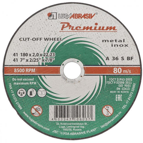 Круг отрезной по металлу+нерж., 180 х 2,0 х 22 мм, ПРЕМИУМ (Луга)// Россия 73734