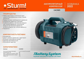 CAC1801 Компрессор аккумуляторный Sturm!, 18В, 1BatterySystem, 10атм, 20л/мин,без АКБ и ЗУ