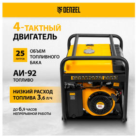 Генератор бензиновый Denzel PS 90 EA 9469343 мощностью 9,0 кВт, с баком объемом 25 л, коннектором автоматики 5-PIN и электростартером, поддерживает напряжение в сети 230 В и подходит для загородного дома, кемпинга, строительной площадки. Выдерживает высокие нагрузки благодаря увеличенному объему двигателя 460 см3. Одновременно к нему можно подключить стиральную машину, обогреватель, холодильник, компьютер, насос и пылесос. Совместно с блоком автоматики Denzel Energomatic PS 115 946714 (в комплект не входит) генератор образует полноценную систему автоматического резервного электроснабжения. Преимущества Надежный двигатель Long Life series — альтернатор имеет медную обмотку, гильза изготовлена из чугуна, цилиндр и картер — из алюминиевого сплава, толкатели клапанов, распредвал и коленчатый вал — из стали. Высококачественные комплектующие — на двигателе установлены карбюратор YINBA/GUOI и свеча зажигания BOSCH. Комплексная защита — благодаря встроенной системе Multi Protect двигатель отключается автоматически при коротком замыкании и при низком уровне масла, что предотвращает поломку оборудования. Высокий ресурс — балансировочный вал снижает уровень вибраций, продлевая срок службы двигателя. Безопасность электросети — на каждой розетке предусмотрен индивидуальный предохранитель. Стабильная работа — блок AVR автоматически регулирует напряжение в сети. Экономичный расход топлива — генератор способен работать при полной нагрузке до 6,9 часов без дозаправки. Быстрый старт — для запуска двигателя достаточно повернуть ключ. Ручной стартер — генератор легко запустится даже после долгого простоя. Удобное управление — положение воздушной заслонки регулируется автоматически. Визуальный контроль основных параметров — цифровой мультиметр отображает напряжение, частоту, количество отработанных моточасов. Полная готовность к работе — бортовой аккумулятор уже есть в комплекте, его не нужно покупать отдельно. Усиленная конструкция — рама из труб диаметром 32 мм с толщиной стенок 1,5 мм защищает генератор от повреждений. Дополнительные возможности — на генератор можно установить транспортировочный комплект Denzel 946725 (приобретается отдельно) для удобного перемещения генератора по рабочей площадке. 83 990,00 ₽ / шт