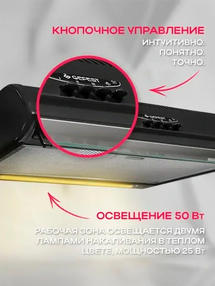 Вытяжка подвесная Gefest ВО-2501 К41 подойдет для применения на кухне. Она используется для очистки воздуха и его отвода из помещения. Удается предотвратить распространение запахов и гари. Ширина встраивания у Gefest ВО-2501 К41 – 50 см. Вытяжка достаточно компактная, не придется выделять много места для ее установки. Высота встраивания – 14 см. Основной цвет – черный. Вам понравится дизайн вытяжки, она способна сочетаться с другими элементами помещения. Конструкция выполнена из металла, есть компоненты из стекла. Вытяжка может работать в режиме отвода или циркуляции. В конструкции присутствуют жировой и угольный фильтры. Происходит очистка воздуха от различных загрязнений, элементы обладают высокой эффективностью. Максимальная производительность – 300 м³/ч. Этого хватит при использовании на обычной кухне. Управление простое, применяются удобные кнопки. Количество скоростей – 3, удается определить оптимальный параметр. Максимальный уровень шума при работе – 65 дБ. В вытяжку встроены элементы для освещения. Используются лампы накаливания в количестве двух штук. Мощность каждого элемента составляет 25 Вт, удается осветить зону готовки. 6 490,00 ₽ / шт