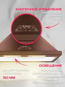 Вытяжка GEFEST ВО 1602 К17- воздухоочиститель электрический бытовой. Эффективно помогает снизить загрязнение стен, потолков и мебели жировыми частицами, сажей, копотью в процессе приготовления пищи. Он относится к приборам, работающим под надзором, и эксплуатируется как в вытяжном режиме, так и в циркуляционном (очищенный воздух возвращается в помещение кухни). Внутри короба воздухоочистителя располагаются вентилятор и узел подсветки. Снизу короб закрывается металлическим фильтром. На передней поверхности короба расположены кнопки управления работой воздухоочистителя. В верхней полости короба воздухоочистителя находится фланец для отвода очищенного воздуха. Минимальное расстояние между плоскостью установки посуды на плиту (нагревательной поверхностью) и воздухоочистителем должно быть 75 см. Воздухоочиститель крепится на ровную поверхность. Панель управления находится на передней поверхности короба. Управление производится прикосновением к сенсорной зоне на стекле в соответствии с обозначенным символом необходимой функции. Таймер включается нажатием и удержанием (приблизительно 5 секунд) кнопки режима работы вентилятора. 10 100,00 ₽ / шт