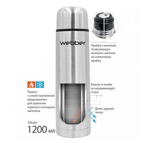 Термос WEВBER SS-1200P, 1200мл. удобен в походах, на рыбалке, в долгой дороге в зимнее время года и в других ситуациях. Его можно использовать даже дома для поддержания температуры напитков или просто горячей воды. Модель выполнена из прочной и нетоксичной нержавеющей стали, имеет стильный серебристый цвет и простоту эксплуатации. Пробка с кнопкой, позволяющая наливать напиток не отвинчивая пробку. Диаметр горлышка: 8см. Время сохранения тепла — 14 часов, холода — 20 часов. 1 100,00 ₽ / шт