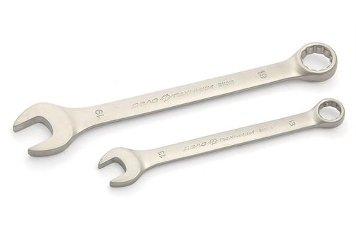 Классический вариант комбинированного гаечного ключа с рожковым профилем на одной стороне и двенадцатигранным накидным профилем на другой. Комбинированный ключ является самым распространенным вариантом гаечного ключа т.к. совмещает в себе возможности рожкового и накидного профилей. Накидной профиль отведён от продольной оси тела ключа на 15° это позволяет работать в ограниченном пространстве. Точность изготовления 12-гранного накидного профиля сводит к минимуму вероятность слизывания граней крепежа. Угол наклона рожковой части относительно продольной оси тела ключа - 15°, что позволяет довести минимальный угловой шаг при работе в труднодоступных местах до 30°. 210,00 ₽ / шт