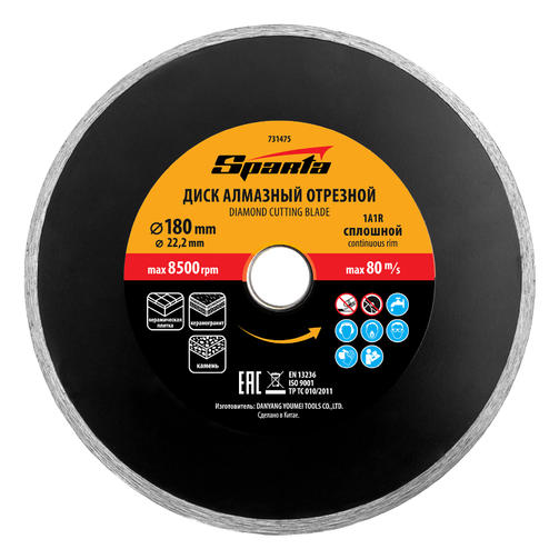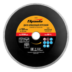 Отрезной алмазный диск Sparta 731475, сплошной, 180 х 22,2 мм - расходный инструмент для болгарок и плиткорезов, используемый для мокрого резания. Он позволяет выполнить аккуратный рез по керамике, керамограниту и мрамору в бытовых условиях. Рекомендуется применять с использованием водяного охлаждения. 510,00 ₽ / шт
