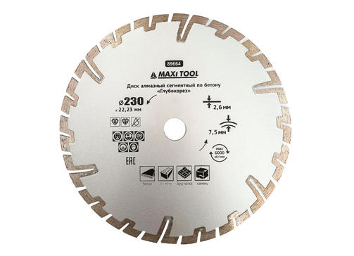 Диск алмазный Глубокорез сегмент.230X7.5X2.6X22.23мм 89664 с защит.секторами для cух.резки MaxiTool