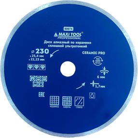 Диск алмазный ультратонкий сплошной PROFI 230x1.7x6x25,4/22.23 мм 89974 д/влаж резки (25шт) MaxiTool