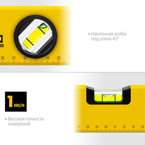 Уровень строительный STAYER 3460-100_z04, предназначен для контроля горизонтальности и вертикальности поверхностей Точность измерений 1 мм/м Наклонная колба под углом 45° На боковую поверхность нанесена линейка для дополнительного удобства измерений 850,00 ₽ / шт