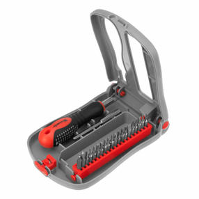 Отвертка для точных работ Matrix Fusion 11584, с насадками, — это набор из 22 предметов в пластиковом пенале, который используется для ремонта электротехники, очков, мобильных телефонов, ноутбуков и т.д. Набор пригодится профессиональным мастерам. 20 бит для точных работ и битодержатель, входящие в комплект, обеспечивают эффективное решение поставленных задач. Преимущества Стержень и биты выполнены из легированной стали CrV, закаленной до твердости 50-55 HRC, что придает им высокую прочность и надежность. Мощный магнит на присоединительном шестиграннике гарантирует надежность удержания бит. Намагниченный наконечник бит повышает удобство работы, позволяя одной рукой придерживать закрепляемую деталь. Трехкомпонентная рукоятка с подпальцевыми выемками и противоскользящим покрытием обеспечивает комфортную работу. Набор поставляется в кейсе с подпружиненной крышкой и поворотной плашкой для бит для удобства хранения, транспортировки и эффективной организации рабочего пространства. 1 224,00 ₽ / шт