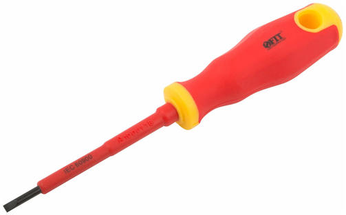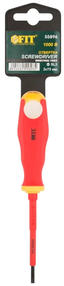 Изолированная отвертка CrV 1000V SL 3х75 мм FIT 55896 - ручной инструмент для профессионального монтажа и демонтажа. Имеет изолирующее покрытие, что позволяет работать с напряжением до 1000V. Прорезиненная рукоятка препятствует выскальзыванию инструмента во время работы. Стержень изготовлен из высокопрочной стали с добавлением сплавов хрома, ванадия и обладает высокой прочностью. Особенности отвертки FIT 55896 Изолированный стержень Стержень из хром-ванадиевого сплава высокопрочный и долговечный. 300,00 ₽ / шт