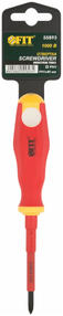 Изолированная отвертка CrV 1000V 4.5х80 мм РН1 FIT 55893 - ручной инструмент для профессиональных работ по монтажу и демонтажу. Подходит для закручивания и выкручивания шурупов и болтов, для работы с напряжением до 1000V. Стержень изготовлен из высокопрочной стали с добавлением сплавов хрома и ванадия. Отвертка обладает высокой прочностью. Размер шлица - РН №1. Особенности отвертки FIT 55893 Удобная рукоятка Прорезиненная ручка имеет удобную форму и отверстие для подвешивания. 300,00 ₽ / шт