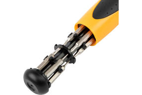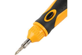 Реверсивная отвертка Denzel mini 7711609 с механизмом SmartPush комплектуется 11 сменными битами из стали CrMo для точных работ с маленькими деталями. С ее помощью можно отремонтировать электротехнику, часы, очки, детские игрушки, мелкие бытовые приборы, а также технику Apple. Реверсивный механизм повышает удобство и скорость работы, снижая усталость рук. Отвертка станет незаменимым помощником в доме и мастерской. Преимущества Прочность и долговечность — биты изготовлены из износостойкой стали CrMo. Удобная эксплуатация — наконечники бит намагничены, что позволяет насадить крепеж на биту и освободить одну руку. Быстрый доступ к битам — механизм Smart Push автоматически выдвигает битодержатель при нажатии кнопки на корпусе. Комфортная работа — эргономичная двухкомпонентная рукоятка удобно лежит в руке. Продуманная транспортировка и хранение — специальный колпачок защищает рабочую биту от повреждений. 1 200,00 ₽ / шт