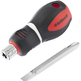Комбинированная отвертка Matrix 11581 из стали CrV, с двухкомпонентной рукояткой и стержнем длиной 38 мм, позволяет монтировать и демонтировать крепеж типоразмера SL6,0 и PH2. Она рассчитана на профессиональное использование, в частности, осуществление строительных и монтажных работ. Благодаря длине стержня 38 мм и укороченной рукоятке можно производить работы в ограниченном пространстве. Преимущества Двухсторонний стержень выполнен из легированной хромованадиевой стали, рабочая часть закалена до твердости 50-55 HRC, поэтому отвертка выдерживает высокие нагрузки. Встроенный зажимной механизм присоединительного шестигранника обеспечивает надежную фиксацию стержня. Наконечник намагничен, что позволяет освободить одну руку и придерживать ею закрепляемую деталь. Двухкомпонентная укороченная рукоятка с подпальцевыми выемками обеспечивает удобство работы и не проскальзывает в руке. 500,00 ₽ / шт
