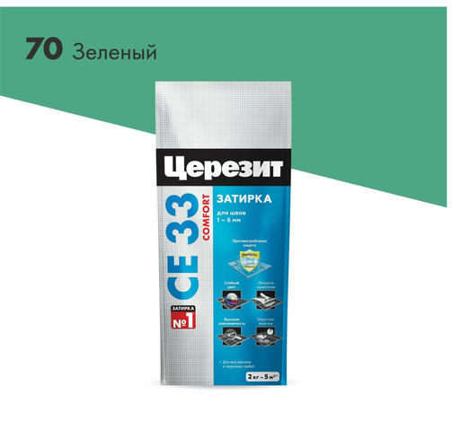 Описание товара Церезит СЕ33 Comfort, цвет зеленый 70, фасовка 2 кг Церезит СЕ33 Comfort предназначена для заполнения швов керамических и каменных облицовок, устроенных на недеформирующихся основаниях (таких как бетон, цементные стяжки и штукатурки), на полах и стенах внутри и снаружи зданий, при ширине шва до 6 мм. Может применяться в небольших крытых бассейнах. . Обладает противогрибковым действием и пригодна для эксплуатации в условиях периодического увлажнения (в ванных комнатах, душевых, кухнях и т.п.). Угловые, деформационные и примыкающие к санитарнотехническому оборудованию швы рекомендуется заполнять силиконовой затиркой Церезит CS 25. . Затирка приобретает заявленный цвет по истечении 24-48 часов в зависимости от условий окружающей среды после затирания швов, выполненного в соответствии с рекомендациями по применению. Оттенок цвета готовой затирки в шве может отличаться от цвета сухой смеси; обозначенного цвета на упаковке; рекламных образцов. 400,00 ₽ / шт