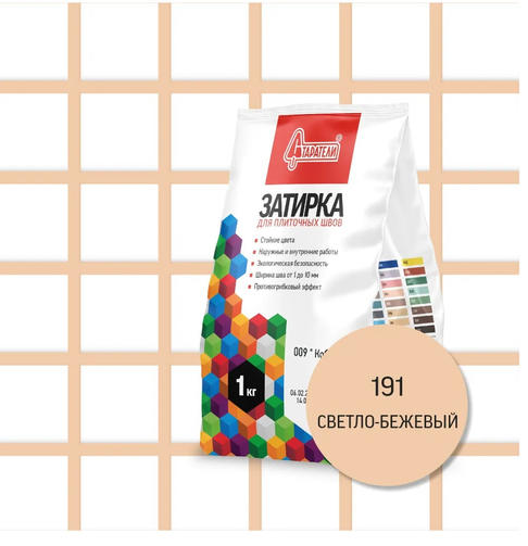 Затирочная смесь для плиточных швов Старатели 1 кг, светло-бежевая 191 3277/3557 - применяется для заполнения межплиточных швов шириной от 1 до 10 мм при облицовке стен и полов керамической плиткой, керамогранитом, натуральным и искусственным камнем, клинкерной и мозаичной плиткой. Используется на недеформирующихся основаниях и основаниях, подверженных температурным колебаниям. Подходит для помещений с нормальной и повышенной влажностью (в том числе неотапливаемых), а также для наружных работ. Особенности: Пропорции замеса: 0,25-0,35 л/кг Очистка поверхности после затирки через: 10-20 минут Время конца схватывания, не более: 12 часов Возможность пешего хождения: через 24 часа Окончательное формирование цвета: через 2 суток Начало эксплуатации: через 7 суток Предел прочности при сжатии, не менее: 5 МПа Предел прочности при сжатии после замораживания и оттаивания, не менее: 15 МПа Предел прочности на растяжение при изгибе, не менее: 3,5 МПа Деформация усадки, не более: 3 мм/м Капиллярное водопоглощение через 30 минут, не более: 2 г Капиллярное водопоглощение через 240 минут, не более: 5 г Марка по морозостойкости, не ниже: F50 Срок хранения: 24 месяца Формула для расчета расхода затирки: (A+B) / (A×B) × C × D ×1,13= кг/м² А - длина плитки (мм), В - ширина плитки (мм), С - толщина плитки (мм), D - ширина шва (мм) Подготовка основания: Основание и плиточный клей должны быть сухими, швы должны быть очищены от различных загрязнений. При обновлении затирки на существующей облицовке, старую затирку полностью удалить. Затирку швов можно начинать после затвердевания клеевого раствора, не ранее, чем через 24 часа после приклеивания плитки. Кромки впитывающих плиток рекомендуется увлажнить. Для неглазурованных, матовых или каменных плиток необходимо провести тестирование на окрашивание плитки пигментами, содержащимися в затирке. Рекомендации: Во избежание различия оттенков швов, рекомендуется на одной плоскости использовать затирку одной партии. В течение 24 часов после заполнения швов затирку необходимо предохранять от пересыхания, а в течение 7 дней - от контакта с водой. 200,00 ₽ / шт