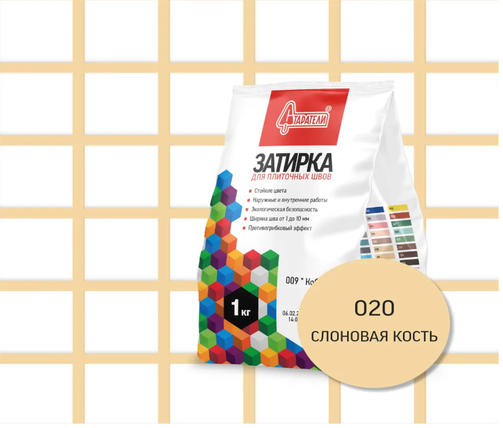 Затирочная смесь для плиточных швов Старатели 1 кг, слоновая кость 020 3277/3506 - применяется для заполнения межплиточных швов шириной от 1 до 10 мм при облицовке стен и полов керамической плиткой, керамогранитом, натуральным и искусственным камнем, клинкерной и мозаичной плиткой. Используется на недеформирующихся основаниях и основаниях, подверженных температурным колебаниям. Подходит для помещений с нормальной и повышенной влажностью (в том числе неотапливаемых), а также для наружных работ. Особенности: Пропорции замеса: 0,25-0,35 л/кг Очистка поверхности после затирки через: 10-20 минут Время конца схватывания, не более: 12 часов Возможность пешего хождения: через 24 часа Окончательное формирование цвета: через 2 суток Начало эксплуатации: через 7 суток Предел прочности при сжатии, не менее: 5 МПа Предел прочности при сжатии после замораживания и оттаивания, не менее: 15 МПа Предел прочности на растяжение при изгибе, не менее: 3,5 МПа Деформация усадки, не более: 3 мм/м Капиллярное водопоглощение через 30 минут, не более: 2 г Капиллярное водопоглощение через 240 минут, не более: 5 г Марка по морозостойкости, не ниже: F50 Срок хранения: 24 месяца Формула для расчета расхода затирки: (A+B) / (A×B) × C × D ×1,13= кг/м² А - длина плитки (мм), В - ширина плитки (мм), С - толщина плитки (мм), D - ширина шва (мм) Подготовка основания: Основание и плиточный клей должны быть сухими, швы должны быть очищены от различных загрязнений. При обновлении затирки на существующей облицовке, старую затирку полностью удалить. Затирку швов можно начинать после затвердевания клеевого раствора, не ранее, чем через 24 часа после приклеивания плитки. Кромки впитывающих плиток рекомендуется увлажнить. Для неглазурованных, матовых или каменных плиток необходимо провести тестирование на окрашивание плитки пигментами, содержащимися в затирке. Рекомендации: Во избежание различия оттенков швов, рекомендуется на одной плоскости использовать затирку одной партии. В течение 24 часов после заполнения швов затирку необходимо предохранять от пересыхания, а в течение 7 дней - от контакта с водой. 200,00 ₽ / шт