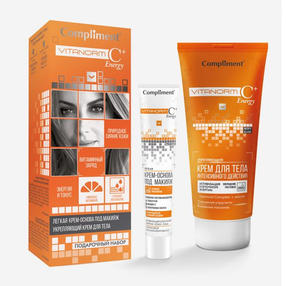 Compliment Vitanorm C+energy Подарочный набор: Compliment Vitanorm C+energy Легкая крем-основа под макияж, 50 мл – 1 шт. Compliment Vitanorm C+energy Укрепляющий крем для тела, 250 мл – 1 шт. Compliment Vitanorm C+energy ЛЕГКАЯ КРЕМ-ОСНОВА ПОД МАКИЯЖ Витаминизированный крем является прекрасной сбалансированной основой под макияж. Благодаря оживляющему средству кожа лица становится мягкой, нежной, эластичной и упругой, приобретает здоровый сияющий вид. Повышается тонус кожи, возвращается природная энергия и красота. ПРИМЕНЕНИЕ: каждое утро наносить на предварительно очищенную кожу лица и шеи тонким слоем до полного впитывания, избегая области вокруг глаз. Дать крему впитаться в течение 5 мин., далее можно наносить макияж. Объем: 50 мл Compliment Vitanorm C+energy УКРЕПЛЯЮЩИЙ КРЕМ ДЛЯ ТЕЛА Ультраувлажняющее средство с роскошной сливочной текстурой превращает процедуру ухода за телом в настоящее удовольствие с мгновенным результатом витаминизирования. Комплекс масел в креме помогает интенсивно питать, смягчать кожу, возвращать эластичность, улучшать тон и текстуру. Масла делают кожу более гладкой, мягкой, шелковистой, ровной, устраняют дряблость и несовершенства. Активные компоненты средства придают очень приятное бархатное ощущение на коже, колоссально увеличивая её увлажненность и упругость. ПРИМЕНЕНИЕ: массирующими движениями нанести средство на кожу тела, уделяя внимание особо сухим участкам. Объем: 250 мл 338,50 ₽ / шт