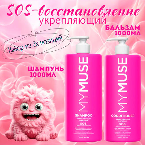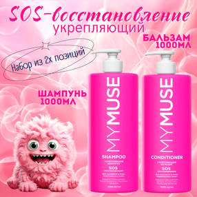 Укрепляющий шампунь SOS восстановление 1000 мл.Шампунь женский MY MUSE SOS-восстановление 1000мл с Кератином, Молочными протеинами и соком Клубники — это идеальный выбор для тех, кто стремится иметь здоровые, сильные и блестящие волосы. Шампунь подходит для всех типов волос. Кератин увлажняет и улучшает структуру волос. Молочные протеины эффективно питают волосы изнутри и придают им жизненных сил, а также способствуют их росту и регенерации. Сок клубники увлажняет, придает блеск, защищает от ломкости и восстанавливает волосы.Укрепляющий бальзам SOS восстановление 1000 мл.Подходит для секущихся и поврежденных волос. Бальзам с эффектом ламинирования, с соком клубники и молочными протеинами, кератином и керамидом — это эффективное средство по уходу за всеми типами волос, в том числе склонными к выпадению. Кондиционер придает мягкость и живой блеск, облегчает расчесывание, делая волосы эластичными, мягкими и увлажненными. Бальзам для волос женский интенсивно питает и придает здоровый блеск волосам, делая их гладкими и ухоженными. 1 711,00 ₽ / шт