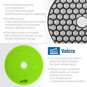 АГШК ЗУБР Профессионал - инструмент для придания поверхности безупречного внешнего вида Преимущества Высокий ресурс и производительность благодаря оптимальному соотношению связки и фракции алмаза Гибкая основа позволяет обрабатывать не только ровные плоскости, но и поверхности с плавными линиями изгибов Система крепления Velcro (липучка) обеспечивает быструю замену круга черновая обработка, обдирка Широкий линейный ряд Широкая сфера применения: обработка каменных столешниц, подоконников, ступеней, скульптур, декоративной плитки, снятие фасок, заусовка, полировка сколов, различные реставрационные работы. Использование Для сухой шлифовки и полировки изделий из натурального и искуственного камня, керамогранита, гранита, мрамора. Используется на ручном электроинструменте (УШМ, полировальные машины, дрели) с насадкой адаптером под липучку Velcro. Охлаждение водой повышает ресурс инструмента. 600,00 ₽ / шт