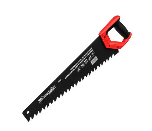 Ножовка по пенобетону Matrix 23380 с полотном длиной 500 мм, с защитным покрытием, с твердосплавными напайками на зубьях и 2-компонентной рукояткой, предназначена для распиливания пеноблоков. Зубья с шагом 38 мм имеют напайки из карбида вольфрама, заточенные под специальным углом, что обеспечивает эффективность работы с твердым материалом. Ножовка используется во время строительства различных сооружений. Преимущества Полотно изготовлено из пружинной стали 65Mn толщиной 1,5 мм и выдерживает повышенные нагрузки. Твердость зубьев составляет 90-92 HRC, поэтому рабочая кромка долго сохраняет режущие свойства. На поверхность полотна нанесено тефлоновое покрытие, защищающее от коррозии и увеличивающее антифрикционные свойства ножовки, что облегчает распиловку. Полотно закреплено в рукоятке при помощи 3 винтов, что обеспечивает надежность конструкции. Эргономичная двухкомпонентная рукоятка удобно ложится в руку, повышая комфортность работы. Ножовка изготовлена на японском оборудовании по современной технологии, чем обусловлено ее высокое качество. 1 934,00 ₽ / шт