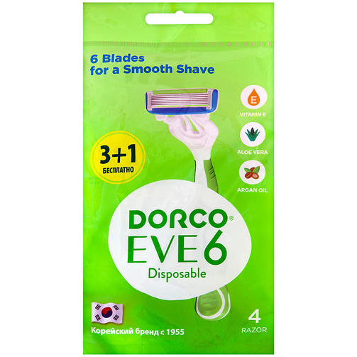Dorco Бритвы одноразовые EVE6, 6-лезвийные, плавающая головка, увлажняющая полоса, прорезиненная ручка (4 станка). Шесть лезвий обеспечивают комфортное, мягкое бритье за одно движение. Легкое промывание всех 6 лезвий благодаря открытой архитектуре обратной стороны бреющей головки. Специальное резиновое покрытие ручки делает бритье более комфортным. Революционная конструкция плавающей бреющей головки идеально повторяет контуры Вашего тела, обеспечивая гладкость бритья. В упаковке 4 бритвенных станка. 200,00 ₽ / шт