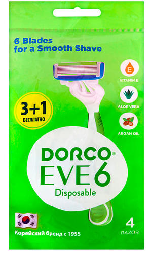 Dorco Бритвы одноразовые EVE6, 6-лезвийные, плавающая головка, увлажняющая полоса, прорезиненная ручка (4 станка). Шесть лезвий обеспечивают комфортное, мягкое бритье за одно движение. Легкое промывание всех 6 лезвий благодаря открытой архитектуре обратной стороны бреющей головки. Специальное резиновое покрытие ручки делает бритье более комфортным. Революционная конструкция плавающей бреющей головки идеально повторяет контуры Вашего тела, обеспечивая гладкость бритья. В упаковке 4 бритвенных станка. 530,00 ₽ / шт